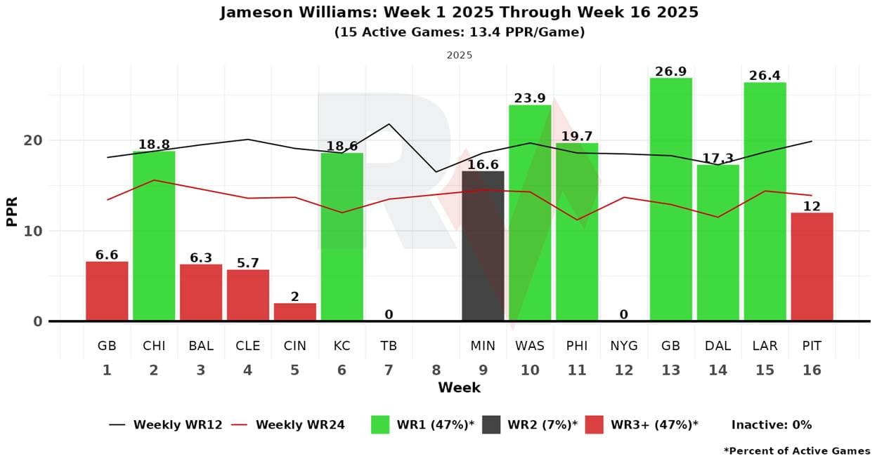 Williams has been on fire lately, putting up five WR1 outputs in his last seven games. In keeping with his sort of boom/bust reputation, the other two performances were outside of the top 24, including one total whiff in Week 12.