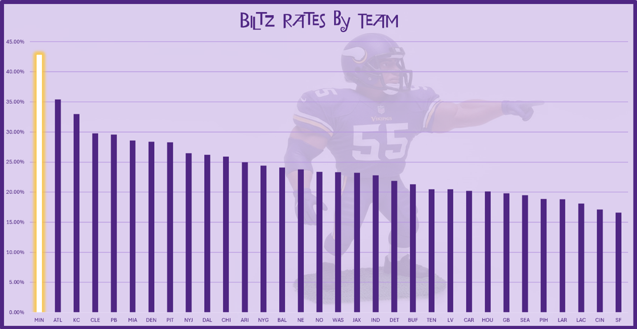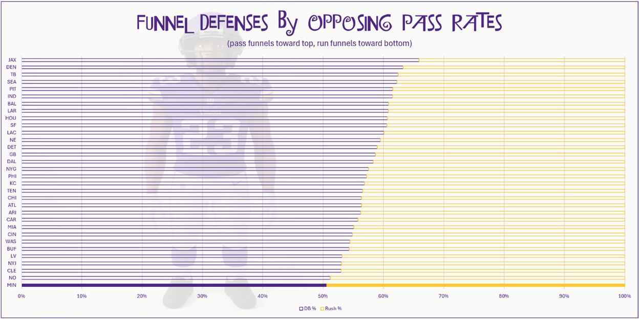This has led the Vikings to become the league's most significant run funnel, as teams have chosen to pass just 50.6% against them (32nd).