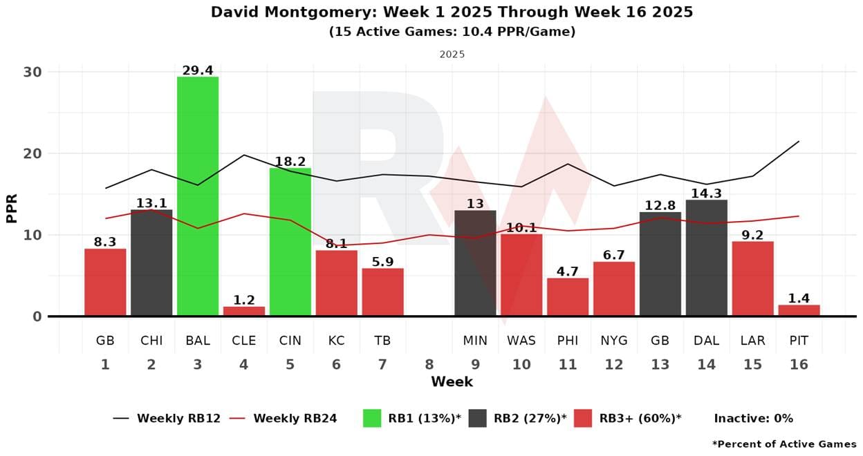 Montgomery has flashed upside, hitting a near-30-point performance against Baltimore in Week 3 and an additional RB1 week, but he has not been anywhere near that since Week 6, recording three top-24 weeks and six single-digit PPR games. Last week, he was disastrous for fantasy GMs.