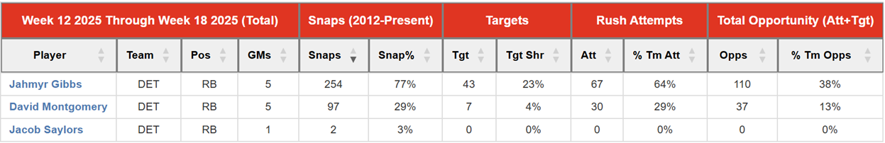 Gibbs continues to serve as the Lions’ primary RB, drawing a 77% snap share (3rd), a 23% target share (1st), and earning 64% of the team’s rush attempts (3rd). Gibbs has one of the best roles in the NFL—probably second to Christian McCaffrey’s.