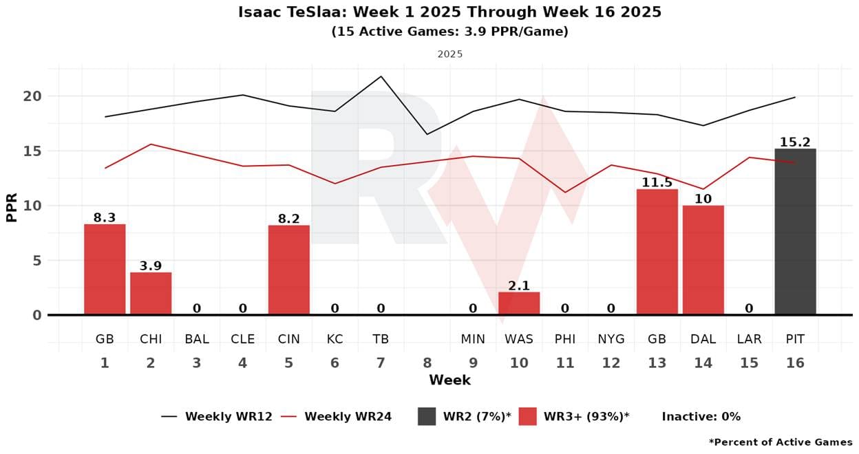 10,000-foot view: the matchup against Minnesota is not great for an “X”; the shell/blitz combination the Vikings employ tends to scheme those types out. In general, I’d look for better options than TeSlaa. Without a TD (which is very possible at any moment for him), he’s not likely to have a great game here no matter how the chess game plays out.