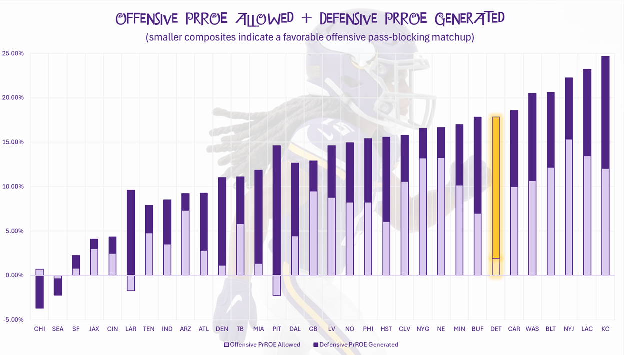 The Lions’ offense allows a 1.91% pressure rate over expected (PrROE, 8th), while the Vikings’ defense generates 15.95% PrROE (1st). This gives the Lions a slight disadvantage when pass blocking on offense.