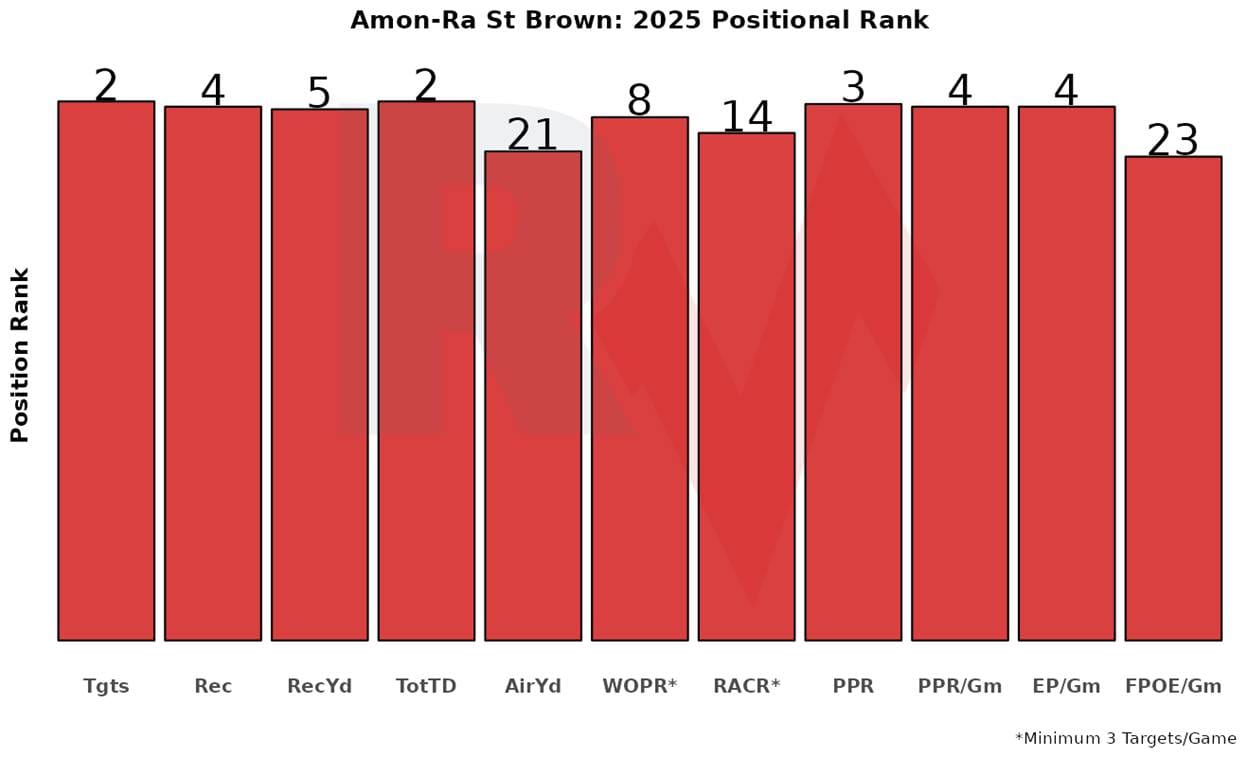 Amon-Ra St. Brown ranks in the top ten in several of the most critical WR stats there are.