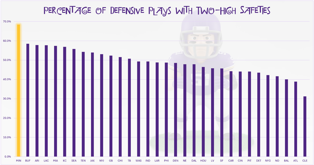 The Vikings run one of the most unique defenses in the NFL under Flores. They use zone at a rate of 76.2% (10th), and they run by far the most shell coverage in the league at 68.4% (1st), a rate that is10 percentage points higher than the Buffalo Bills at second.