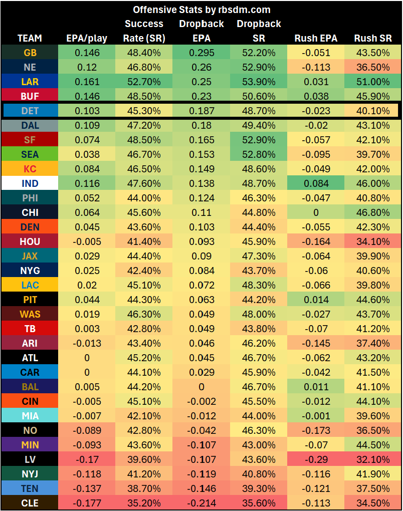 The Lions rank seventh in offensive EPA per play and 12th in offensive success rate. They rank fifth in offensive EPA per dropback and eighth in offensive success rate on dropbacks.