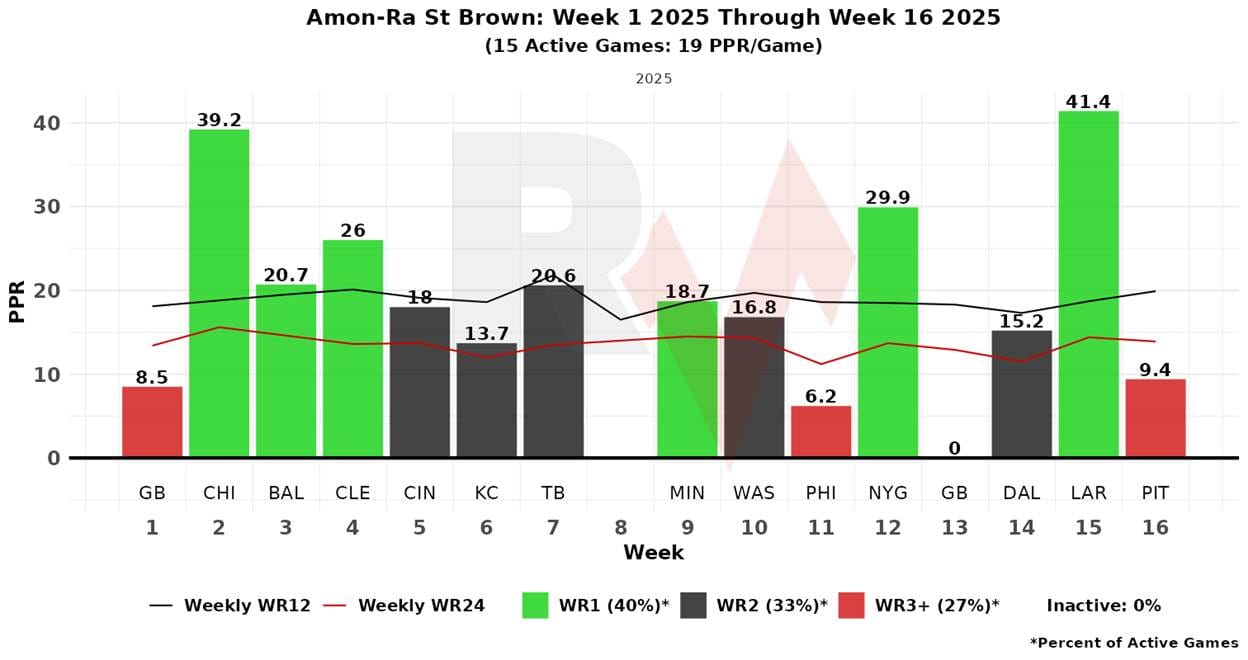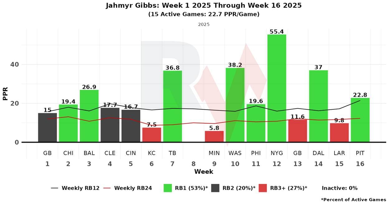 Gibbs’ Week 12 game was the best RB performance of the year at 55.4 PPR points, but he’s hit 35+ PPR points a remarkable four times. In the weeks where Gibbs underperforms, you are taking a hit, for sure; however, you are being penalized far less when that happens than you are being rewarded when he hits on these spike weeks. In those weeks, you basically auto-win.