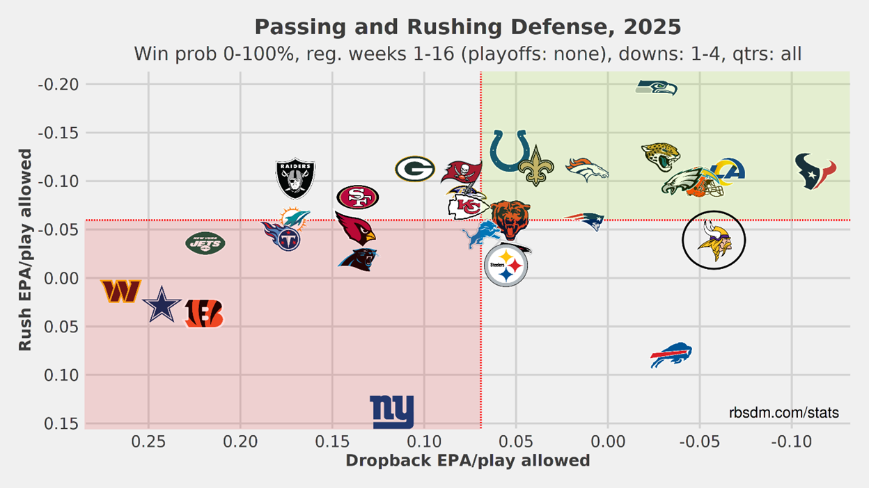 The Vikings’ defense has been well above average in dropback EPA, but below average in rush EPA.