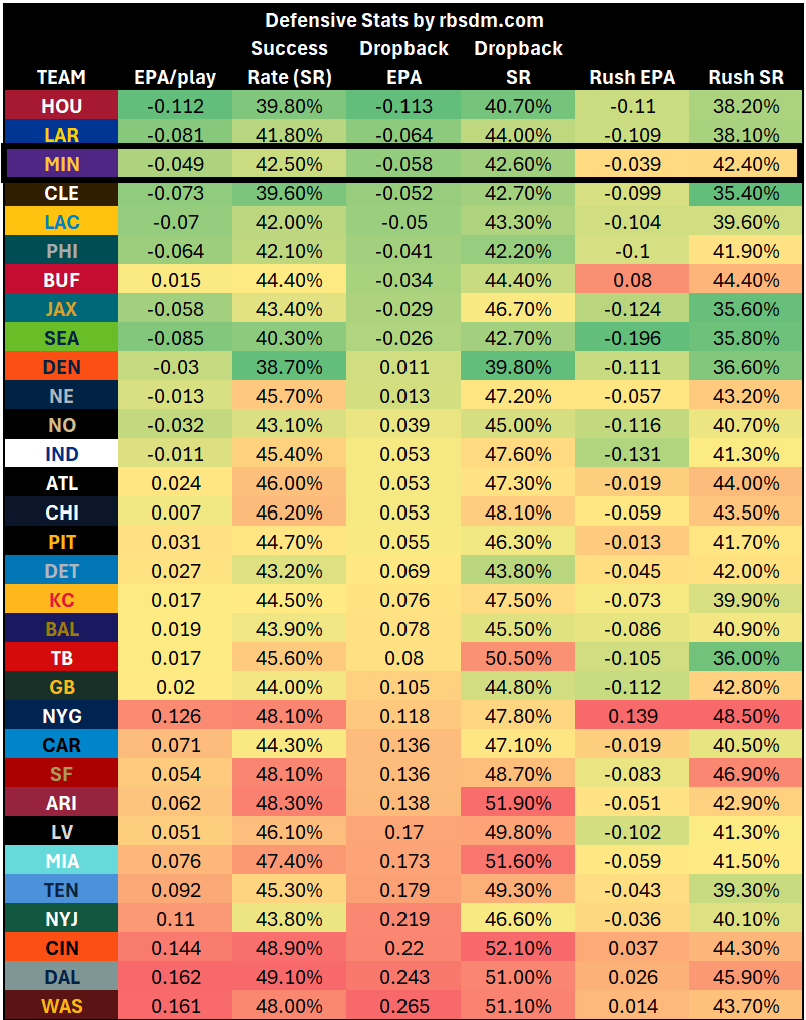 The Vikings rank eighth in EPA per play allowed and defensive success rate. They rank third in EPA per dropback allowed and fourth in defensive success rate on dropbacks.