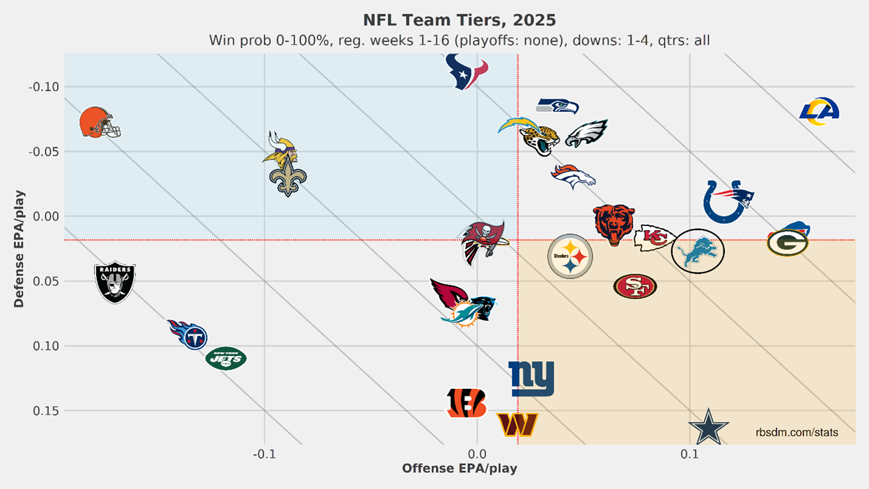 The Lions are well above average in offensive EPA, but they are slightly below average in defensive EPA allowed. In fantasy, we want to target players from teams that are above average on offense and below average on defense.
