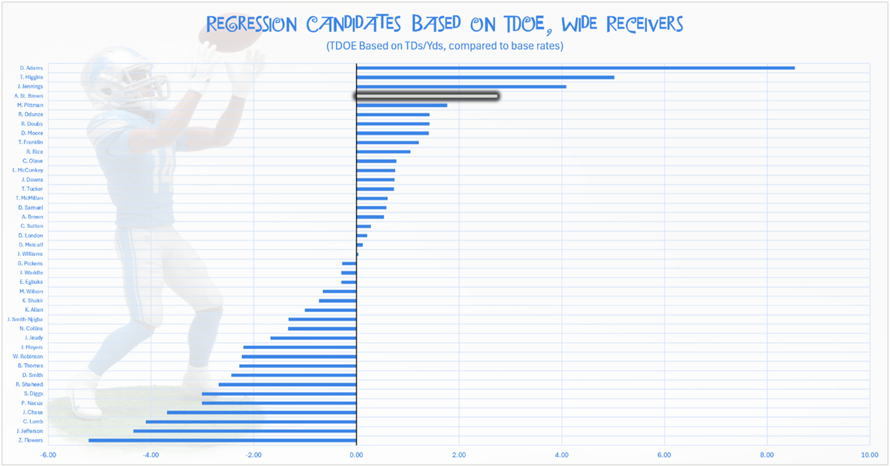 I have a simple touchdowns-over-expected model (TDOE). I divide each player's TDs by his yards, find the average TDs/Yds rate of all qualified players, then determine expected TDs by multiplying that average base rate by each player’s yards. Then, I subtract the expected TDs from the actual TDs. As the season progresses, this becomes increasingly more informative, as we can spot regression candidates. The players in the middle are less susceptible to sudden changes in tendency, but those at the extremes are at real risk of seeing their rates regress toward the mean.