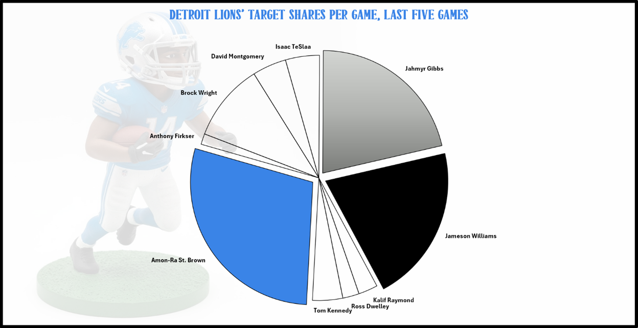 The Lions have three players with a target share per game rate of at least 15%: WRs Amon-Ra St. Brown (28,2%) and Jameson Williams (20.4%), and RB Jahmyr Gibbs (21.0%). In an offense with this much effective pass volume, these are all good percentages.