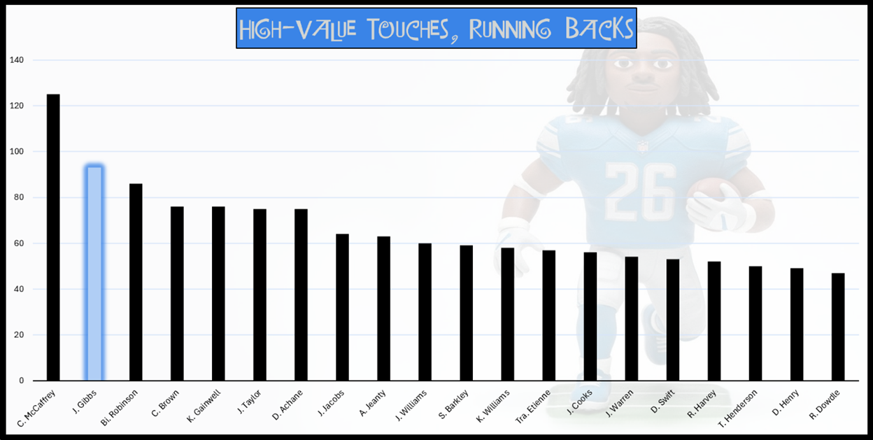 Gibbs’ secret is the mixture of being in terrific offense, being ultra-explosive, and earning a ton of high-value touches (HVTs). Gibbs has earned 93 HVTs (2nd), trailing only McCaffrey. He earns an HVT on 31.7% of his opportunities (2nd).