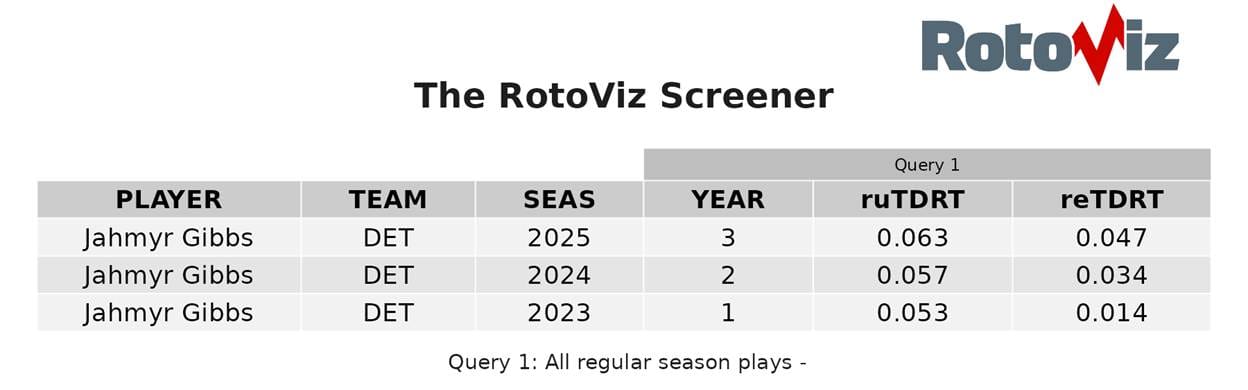 Gibbs’ career rushing TD rate is 5.8%, while his receiving TD rate is 3.3%. His 6.3% rushing TD rate and 4.7% receiving TD rate this season are both career highs. Perhaps more than with Goff and St. Brown, there is a case to be made that he’s running a little hot, but he’s such a unique player and his role has changed so significantly over the last year that this is difficult to quantify.