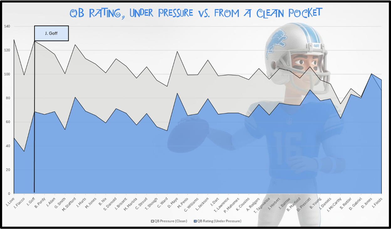 It seems contrary to how fundamentally sound he is, but Goff has struggled against pressure (part of it is that he doesn’t often face it). His pressure-to-sack rate is low at 16.0% (30th), but the problem lies with a massive 59.1-point QB rating delta between paying from a clean pocket and playing under pressure (3rd).