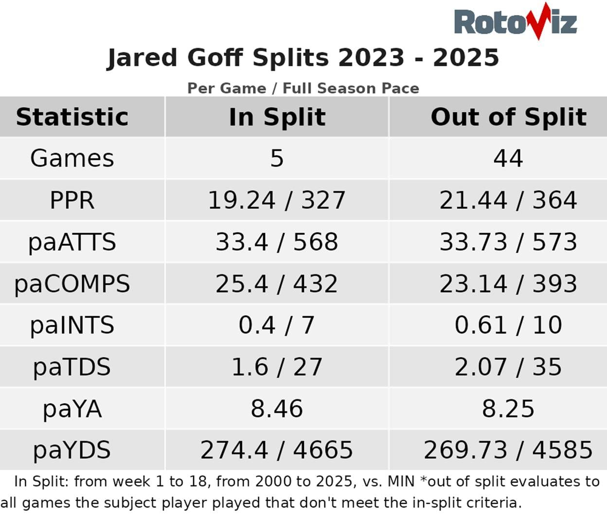 Based on the splits, Goff hasn’t shown a really notable change in his overall production in five games against Flores’ Vikings. The scheme will be very intentional about getting the ball away. This is undoubtedly what the Lions have been discussing all week.