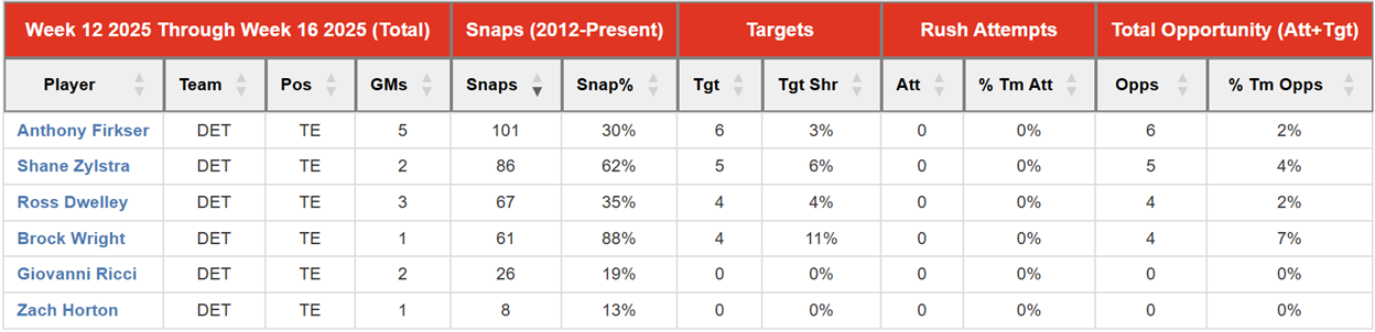 In the last two weeks, Firkser and Zylstra have been the Lions’ two main horses. But as their natural TE3 and TE4, there’s no juice here for fantasy. It would take some chutzpah to try using one of these guys, no matter what.