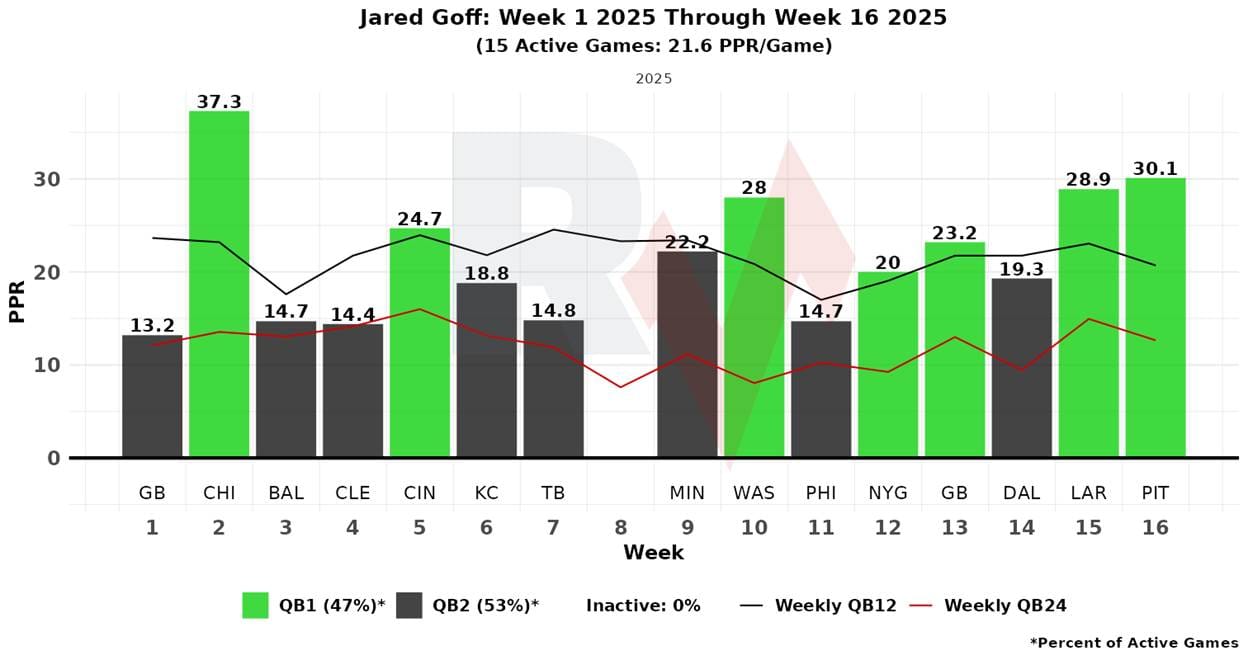 With his high volume, Goff has never scored single-digit fantasy points. He has been a QB1 seven times in 15 games. He can put up spikes, too, having hit over 30 points twice and nearly 40 once.