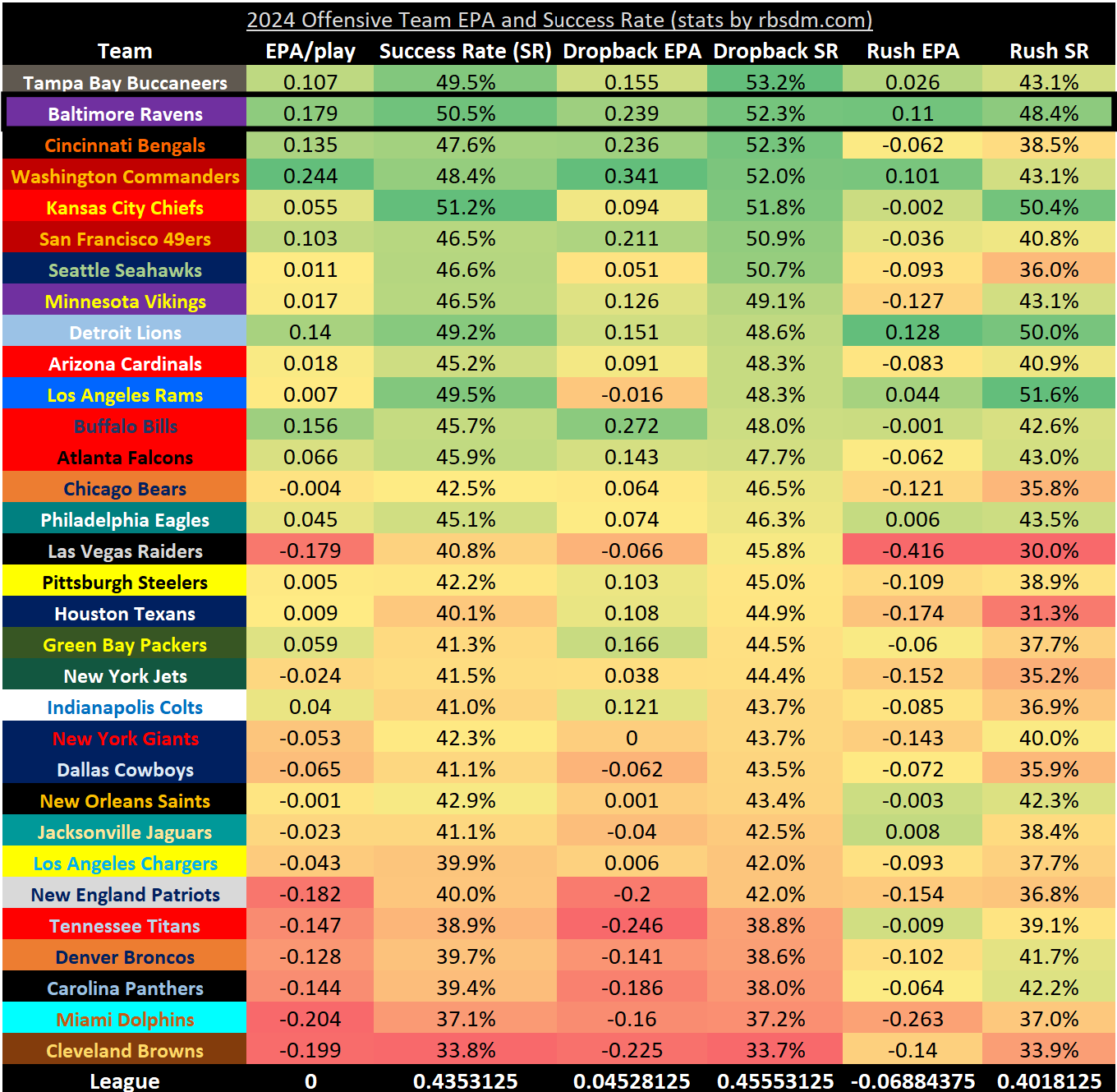 The Ravens have arguably the best offense in the league. They are second in EPA per play to the Commanders and second in success rate to the Chiefs. They are led by two-time MVP Lamar Jackson, who currently has the second-best odds to win MVP. The Ravens are currently third in EPA per dropback and second in offensive success rate on dropbacks.