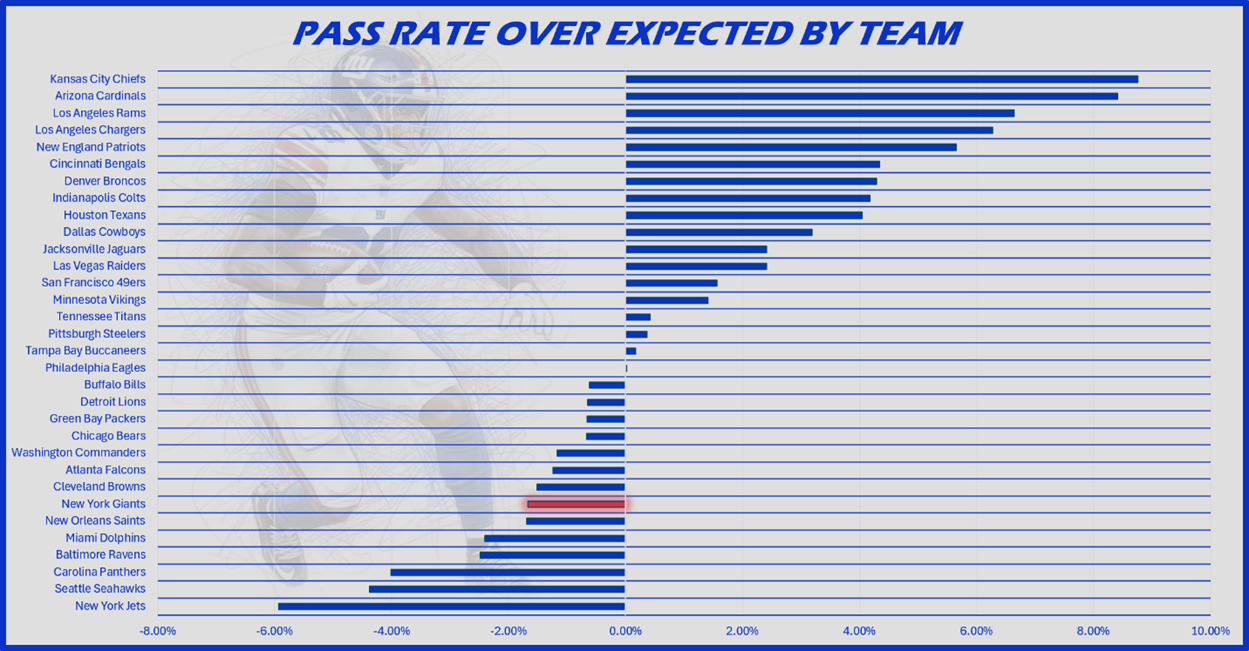 The Giants are 12th in offensive EPA per play and 21st in offensive success rate, indicating they are more likely to hit explosives and less likely to run long, sustained drives. They rank 12th in offensive EPA per dropback and 22nd in offensive success rate on dropbacks.