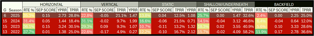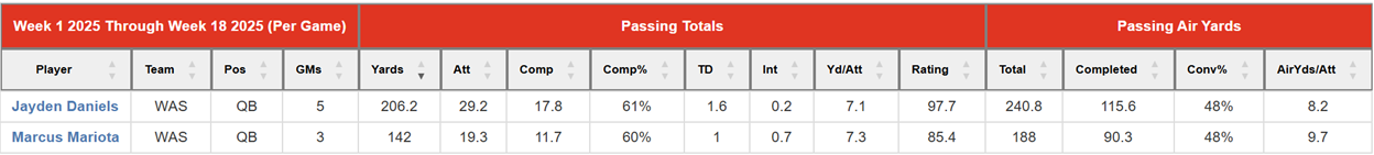 Ertz has been pretty underwhelming as a fantasy asset in 2025. He is not a target earner—this, despite having an extended run without McLaurin (or Austin Ekeler, who has been out since Week 2 with a season-ending torn Achilles). He is barely efficient, and he wouldn’t be at all if it weren’t for his four TDs (T-3rd).