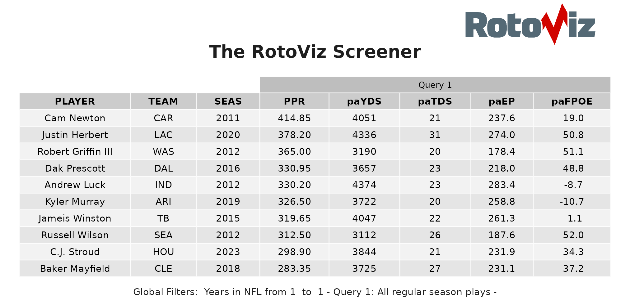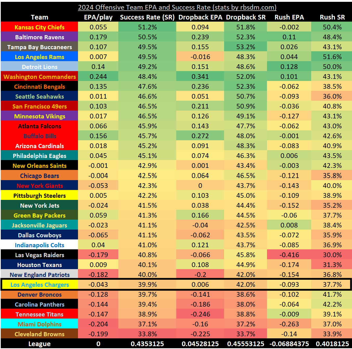 The Chargers are 20th in EPA per dropback and 26th in offensive success rate on dropbacks. They are led by Justin Herbert, who was once crowned the prince of football; now, he is years removed from dominance, still riding a wave of success he had early on. We forget now, but Herbert had the second-best rookie season by a fantasy QB since 2000.