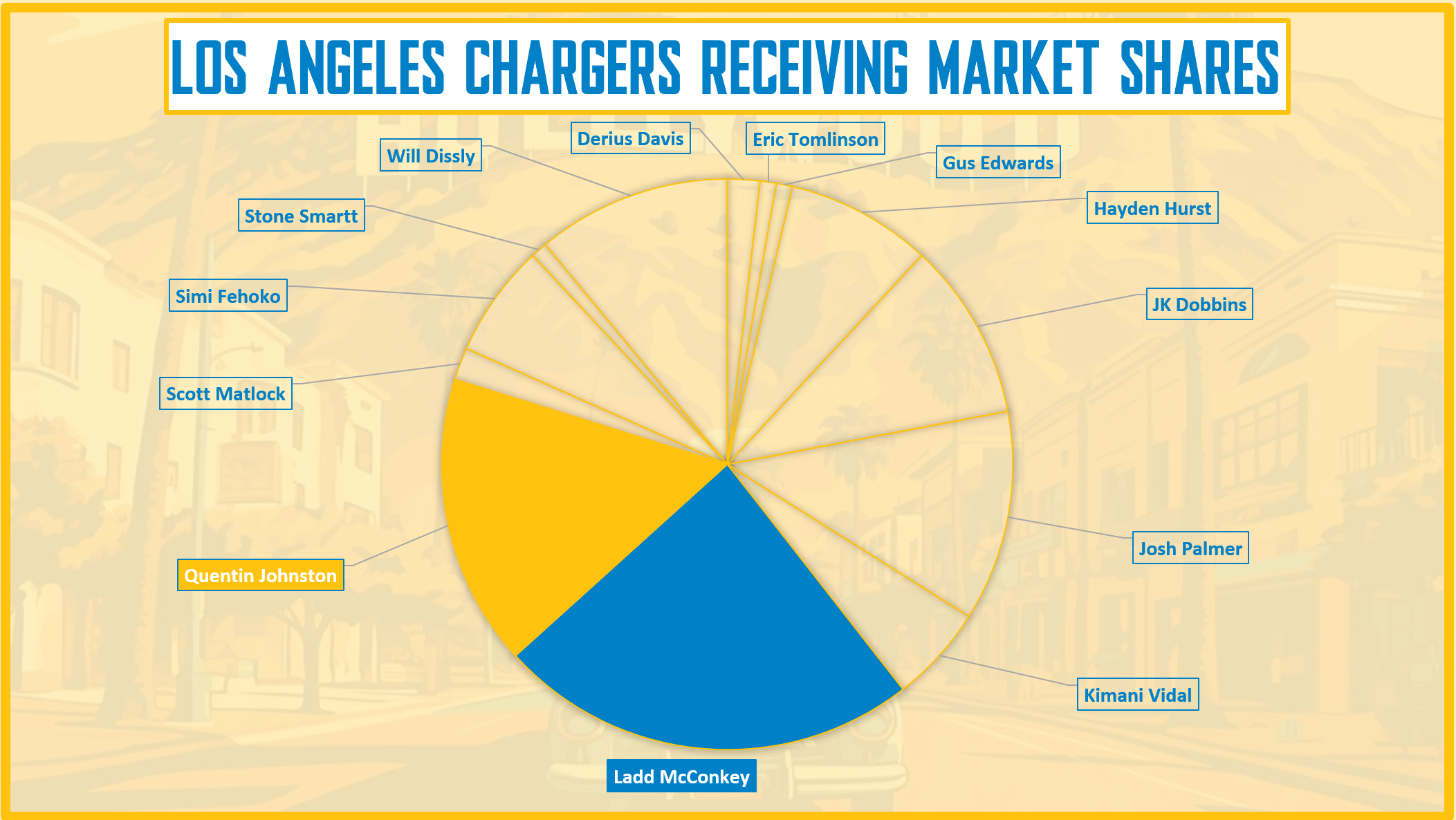 McConkey and Johnston are the only two passing game pieces with 18% or more market share. In an inefficient offense that prefers to run and play slow, it is difficult to rely on pieces that fall below this threshold.