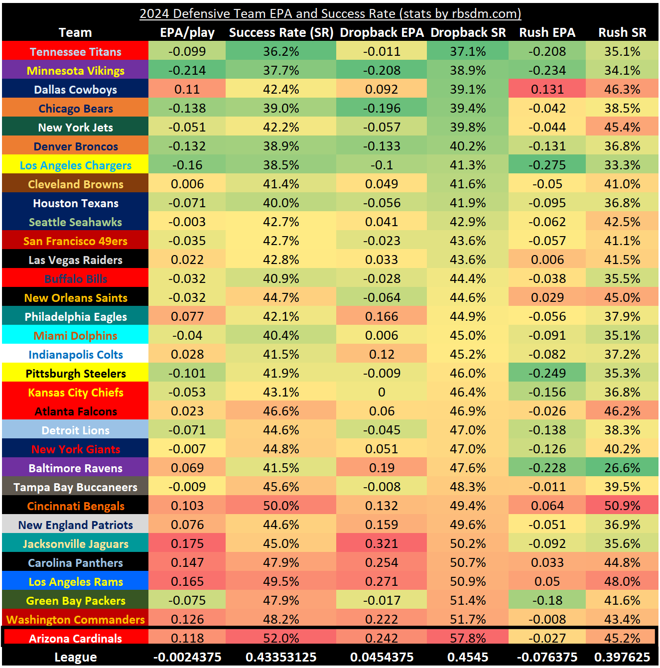 All of this comes with the highly notable caveat that Arizona is terrible at stopping the pass, ranking 29th in EPA per dropback and dead last in defensive success rate on dropbacks. If they wanted to, the Chargers and all their pieces could likely still succeed against Arizona, even without Grade-A talent.