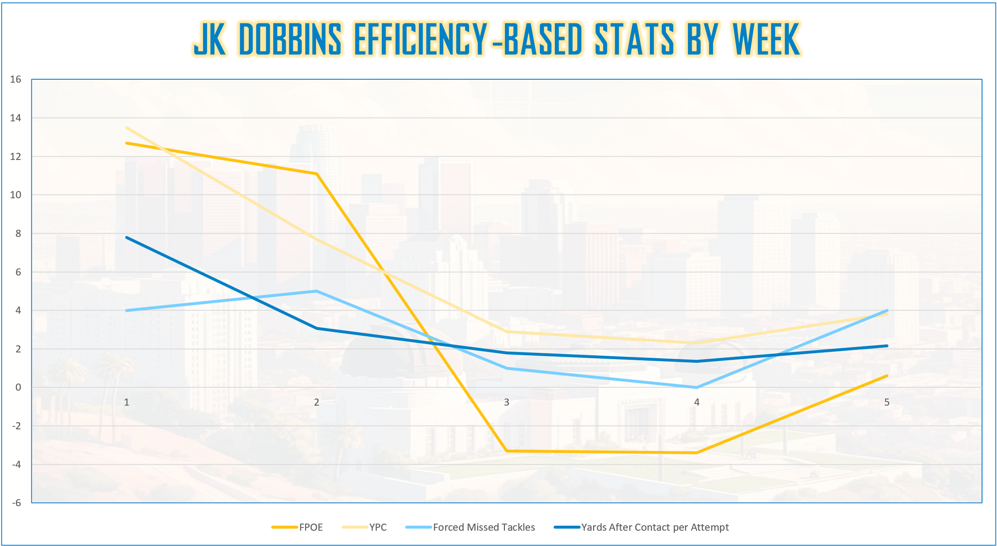 JK Dobbins was used for 25 rushing attempts in Week 6 as the Chargers stomped the Broncos. This was a career-high for him. One downside for Dobbins in recent weeks is that he started incredibly strong in efficiency, which has bottomed out in almost every conceivable way ever since.