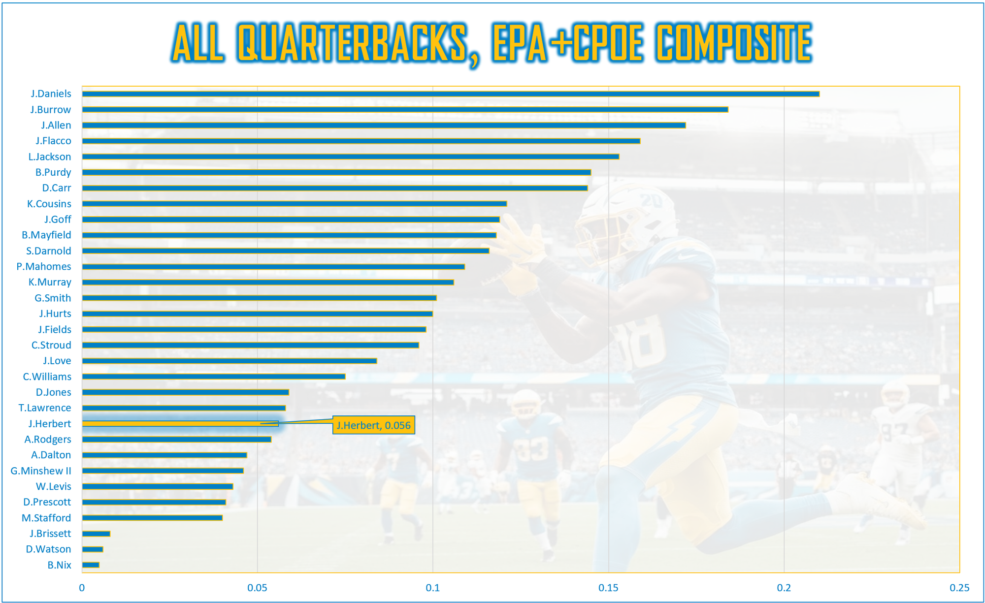 Herbert ranked 11th and 12th in total FPOE after two seasons, accumulating a two-year total of 67.3. Since then, he has zeroed out, scoring -59.3 FPOE in 2022 and 2023 combined, then accruing -8.2 FPOE in five games under Harbaugh. This past week, he fell below a career zero for the first time since his rookie season. He ranks 22nd in EPA + CPOE composite this season.