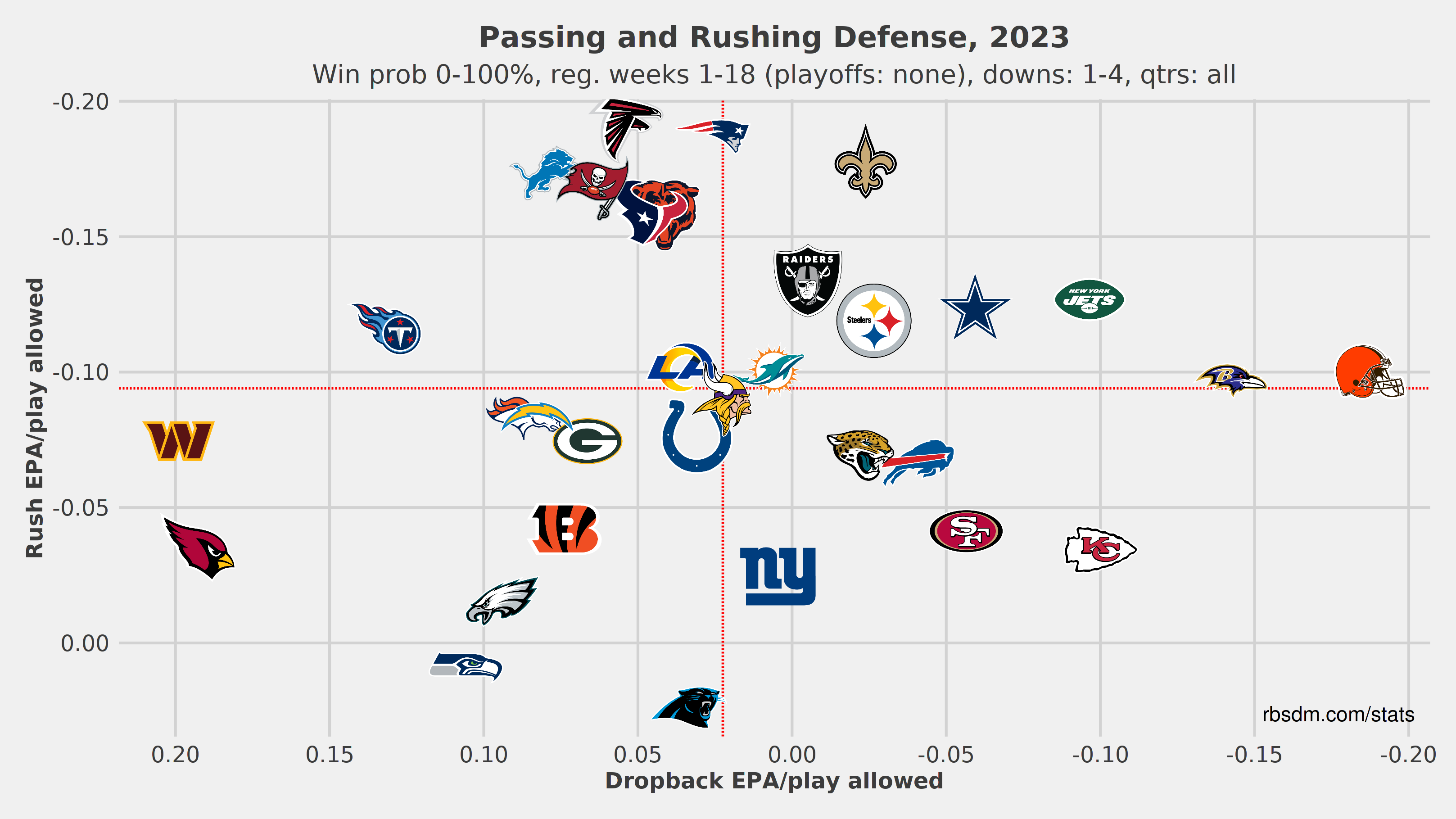 The Chiefs had an excellent season on defense a year ago, and they allowed just -0.076 EPA/play, good for sixth-best in the league. However, their defense was imbalanced in favor of the pass, as they allowed the fourth-fewest passing yards per game while trending toward average in rushing defense. Kansas City traded L’Jarius Sneed to the Titans this off-season; Sneed had the third-lowest EPA/target allowed among NFL corners and was considered by many among the biggest Pro Bowl snubs in 2023.