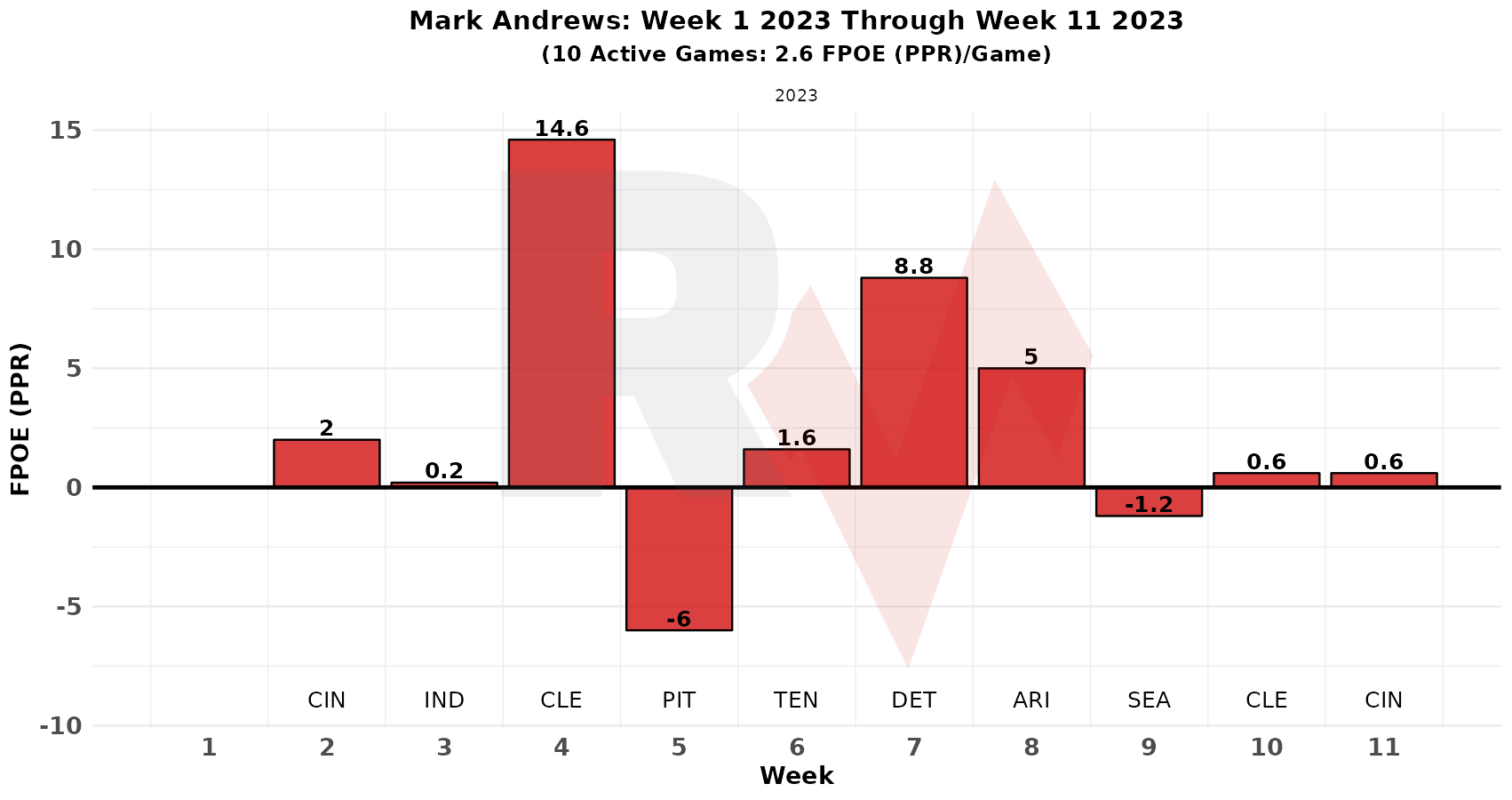 The return of Mark Andrews, fully healthy after a broken fibula forced him out of a Week 11 game and kept him off the field for the rest of the regular season, is critical. Andrews was utilized a little less, averaging 6.2 opportunities per game when he has averaged 6.6 opportunities per game for his career, but his efficiency was good; he was pacing for about 40 FPOE before his injury, ranking 4th in FPOE/game among TEs. Lamar Jackson was good for a 135.1 QBR when targeting Andrews, and Andrews had a 1.93 YPRR – down from his previous seasons but well ahead of most TEs. He was the first read on 17% of his routes. Andrews was available for the AFC Championship but may have been gutting it out somewhat.