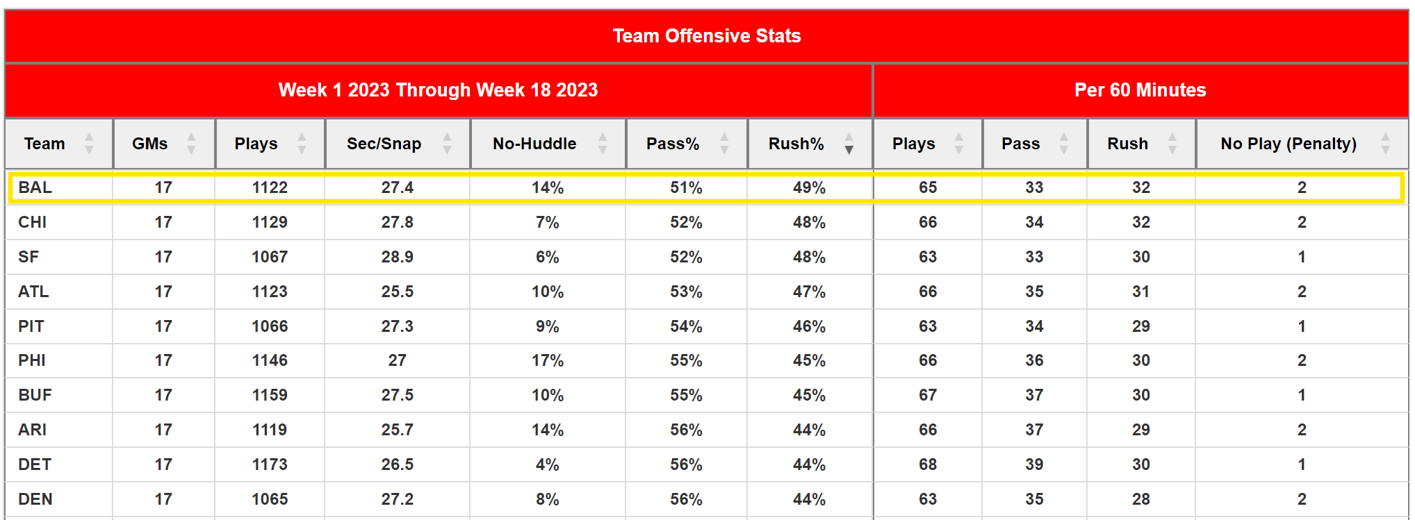 The Ravens were again quite run-heavy in 2023, finishing with a 49% run percentage and leading the league again, as they had in 2019 and 2020; the Ravens have been the run-heaviest offense in the NFL since 2018. However, in 2023, under new OC Todd Monken, indications were that such off-balance ground and pound wasn’t their actual intention.