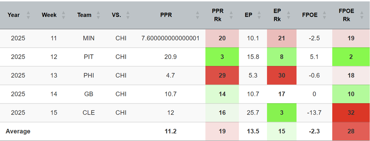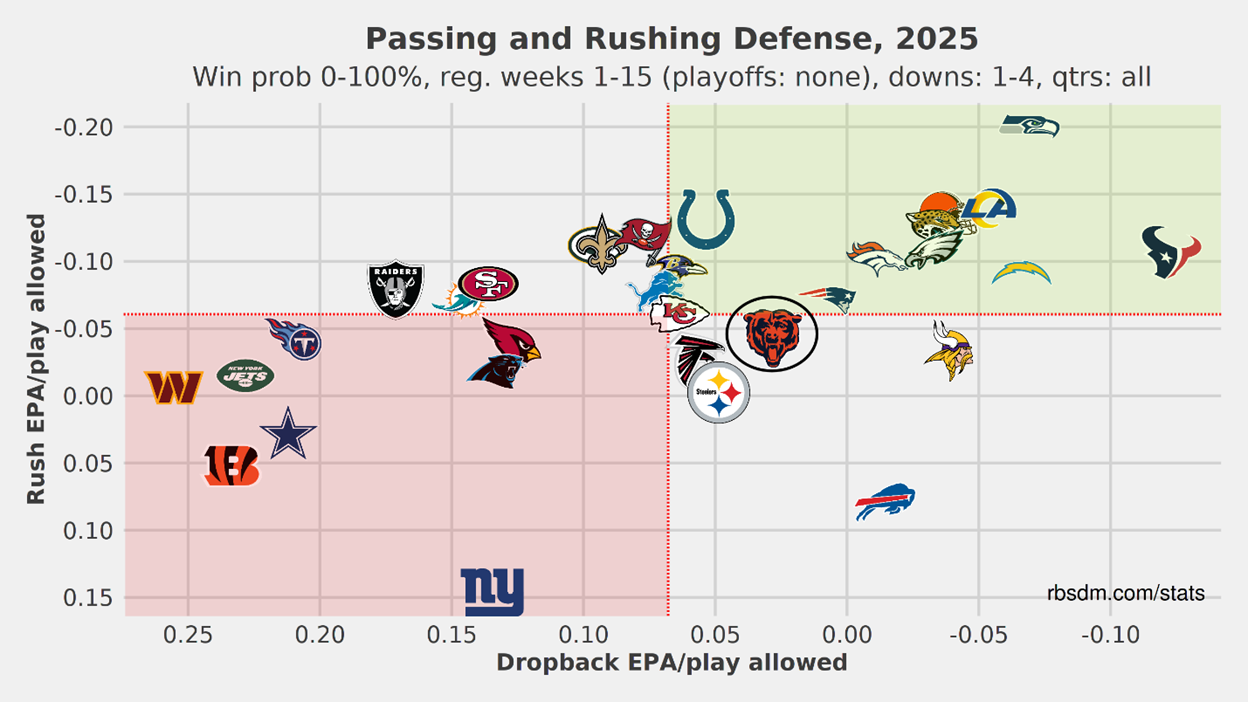 Chicago’s defense is above average in dropback EPA allowed, but below average in rush EPA allowed.