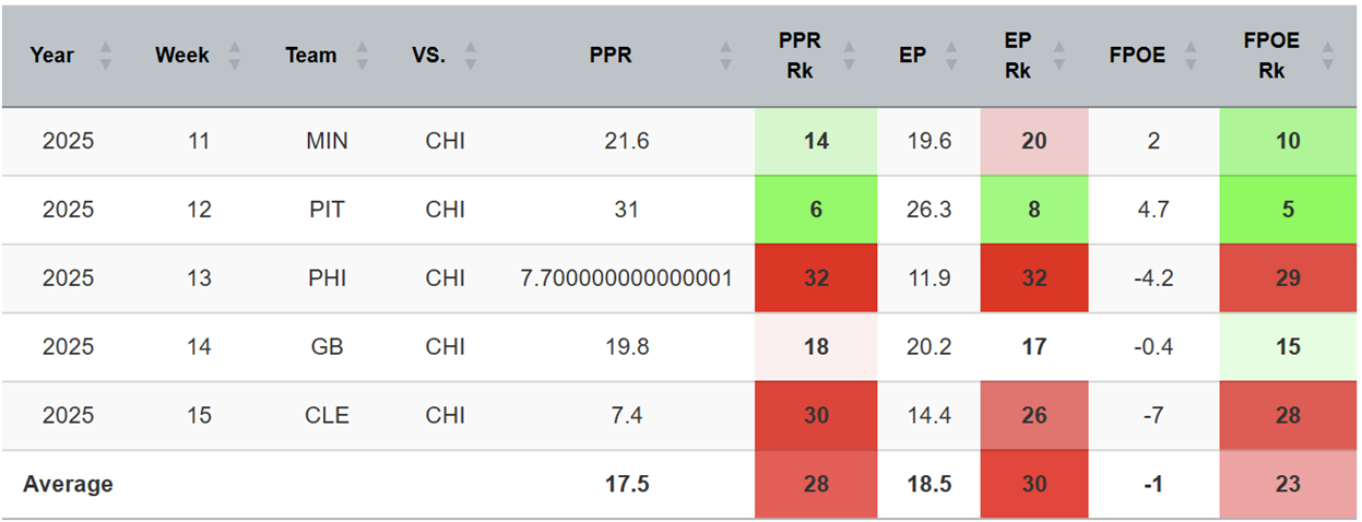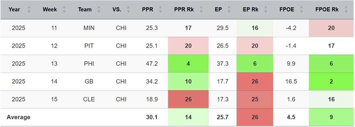 The Bears started the season looking pretty pathetic on defense, but they’ve been far stronger against opposing fantasy QBs of late, holding them to a rank of 27th in their last five games.