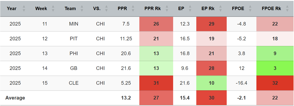 The Bears have surrendered the 14th-most fantasy points to opposing WRs in their last five games. There is a disparity between the ranks of the expected points (EP) allowed and the FPOE. Oddly, this imbalance is almost entirely driven by the Packers’ WRs, who were highly efficient against Chicago in their last meeting.