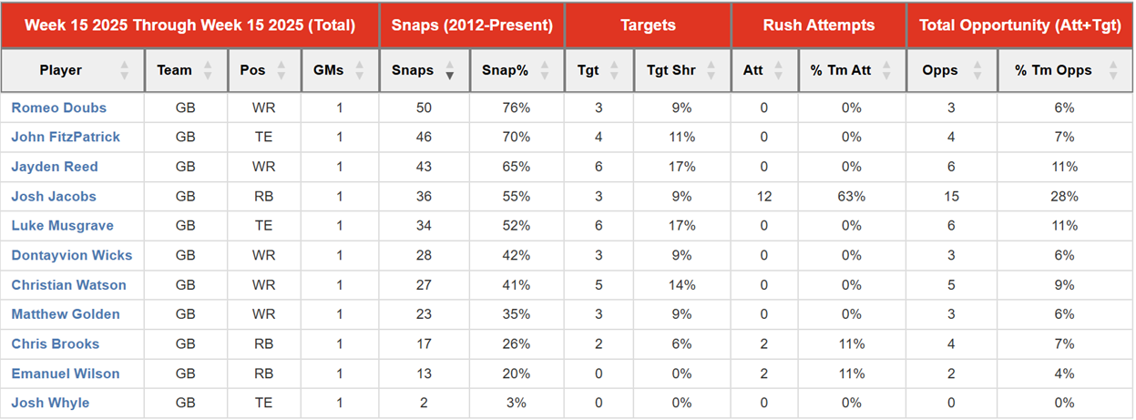 The Packers will be without TE Tucker Kraft all year. Otherwise, they essentially got back to a full-house last week, having WRs Christian Watson, Jayden Reed, Romeo Doubs, Dontayvion Wicks, and Matthew Golden, as well as TE Luke Musgrave, all available. It’s a dreadfully small sample size, but here is how the breakdown of snaps and targets shook out in Week 15: