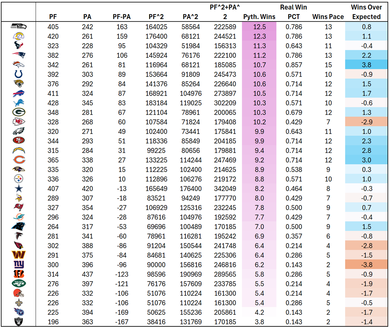 The Bears have the division lead, but according to Pythagorean expected wins, the Packers are the better team. The Bears should be trending for 9.2 wins, while the Packers should be trending for 10.3.