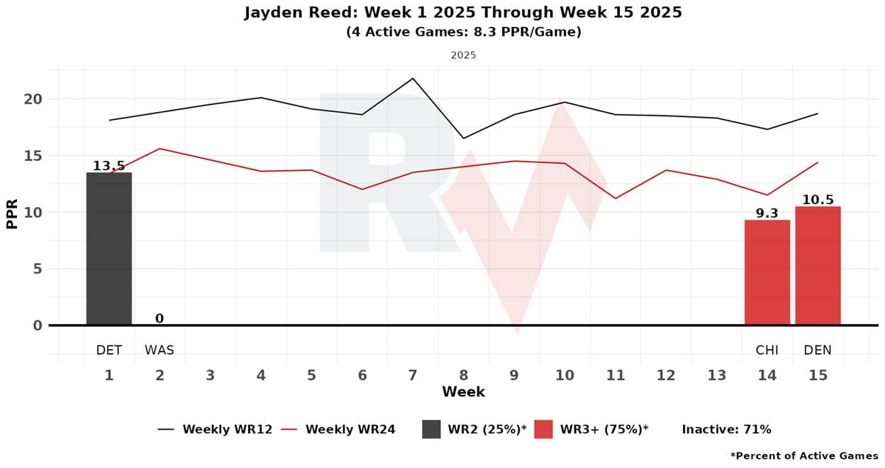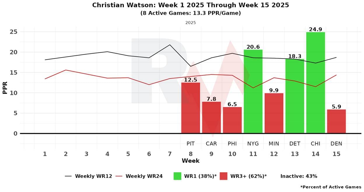 If Watson can’t go, tradition has it that WR Dontayvion Wicks will fill the majority of his snaps. Wicks has had single-digit PPR performance in every game but one, which was a blow-up game in Week 13 in another shootout where Wicks caught two TDs. In that game, with no Reed, Wicks and Watson were splitting time in the slot—each running nearly 40% of their routes from there. This would likely not be the role Wicks would occupy if Watson is out; he would be used far more often out wide. This all comes with a caveat: technically, Wicks is questionable, though he is expected to play.