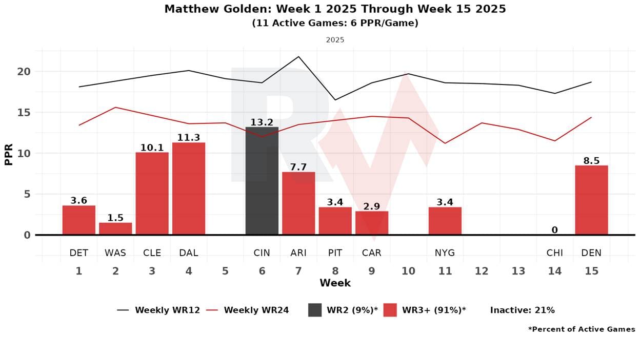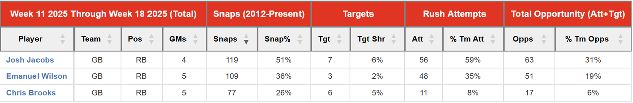 The wild-card is WR Matthew Golden, a first-round rookie. Golden has actually been more consistent than Wicks. He runs out wide more than from the slot. He is not a traditional field-stretcher—Watson is far more like that than anyone else. Watson’s aDOT is 19.3 while Golden’s is 13.8. It isn’t that Golden is being boxed out entirely; he’s third on the team in routes. He just hasn’t really put it all together yet. Resistance to using him is founded; if Watson and Wicks are both out, however, Golden should be considered a strong play.
