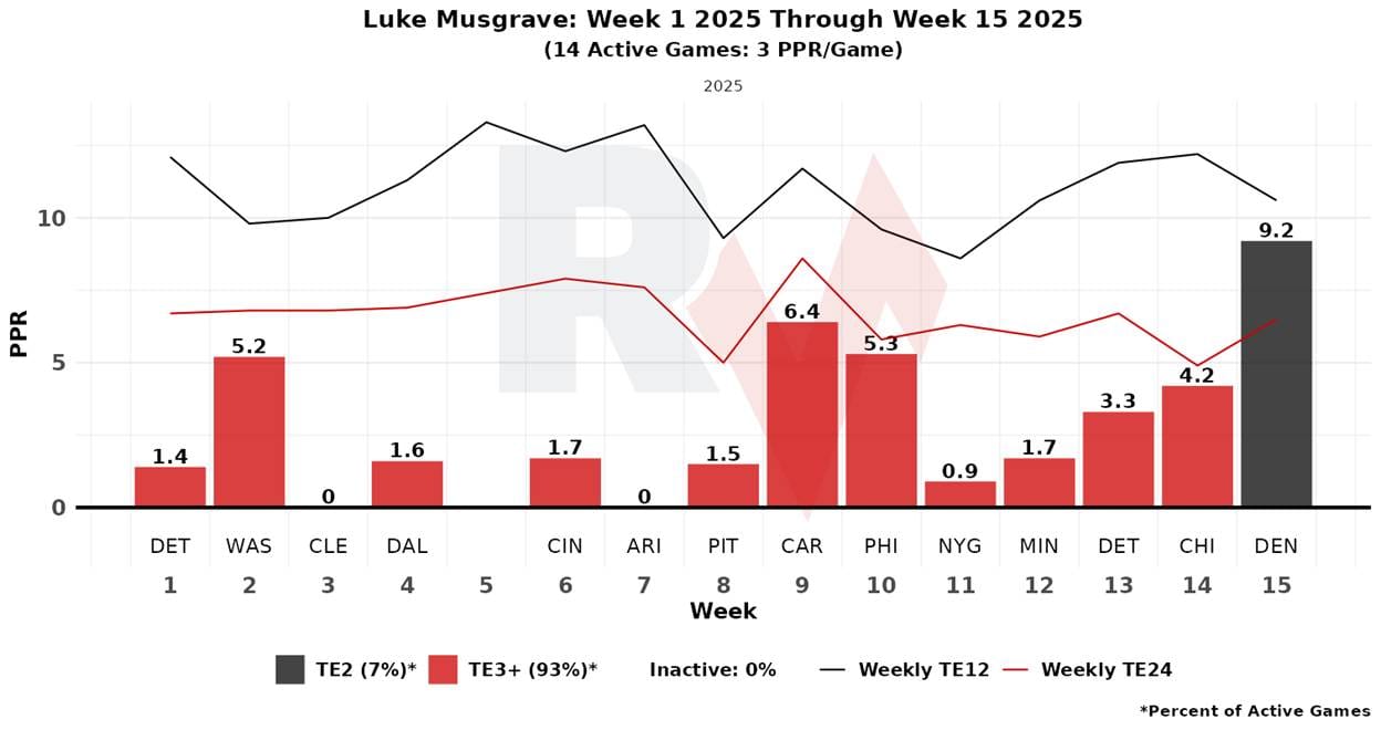 Kraft was a bit of a revelation this year, and his play style is distinct from Musgrave’s. He didn’t draw much volume, but his efficiency, particularly after the catch, was off the charts. Strip that away, and Musgrave is left with the less lucrative role, without a realistic path to replicating the efficiency that drove Kraft’s fantasy production.