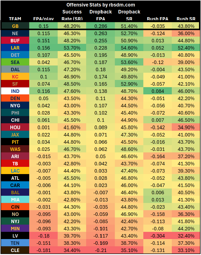 The Packers rank third in offensive EPA per play and fourth in offensive success rate. They rank first in offensive EPA per dropback and fifth in offensive success rate on dropbacks.