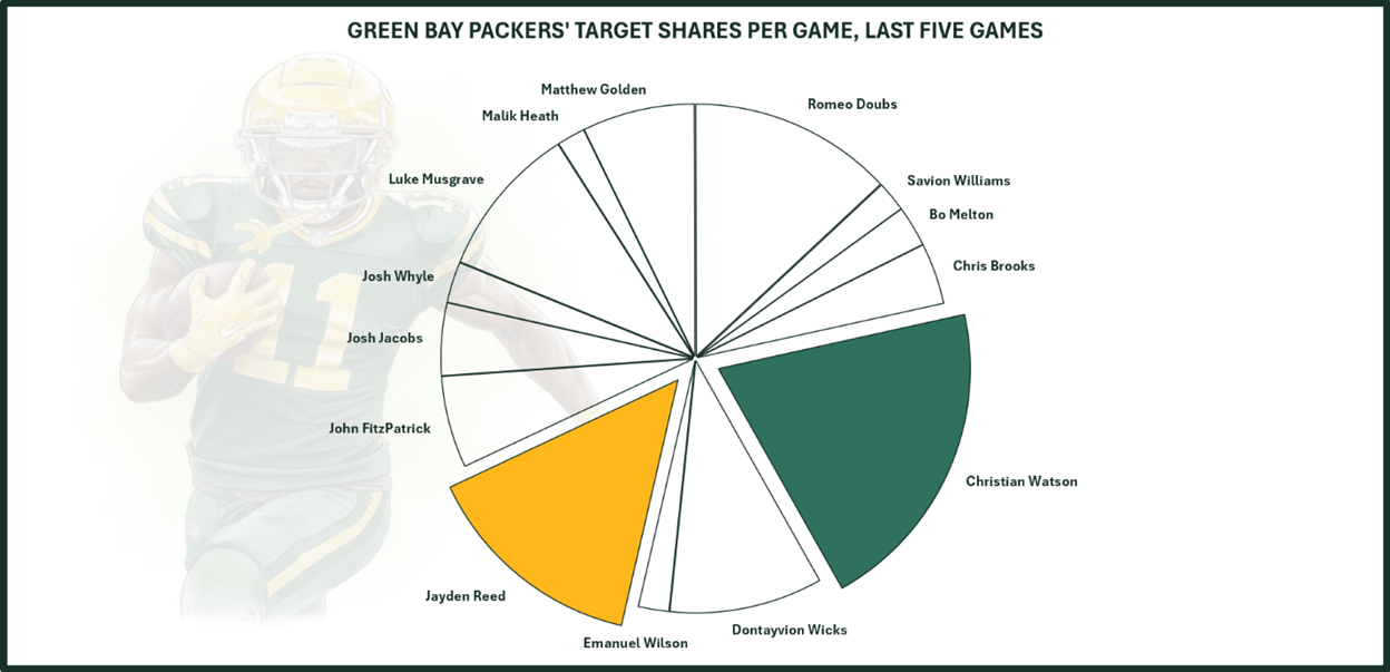 The Packers have had a notoriously broad swathe of pass-catchers involved under LaFleur, at least since the departure of WR Davante Adams. As such, they only have two players with target shares over 15% in their last five games: WRs Christian Watson (21.7%) and Jayden Reed (15.4%). It has been more complicated than we even thought to get a bead on how they prefer to deploy their receivers, however, because there has been a high degree of attrition due to injury.