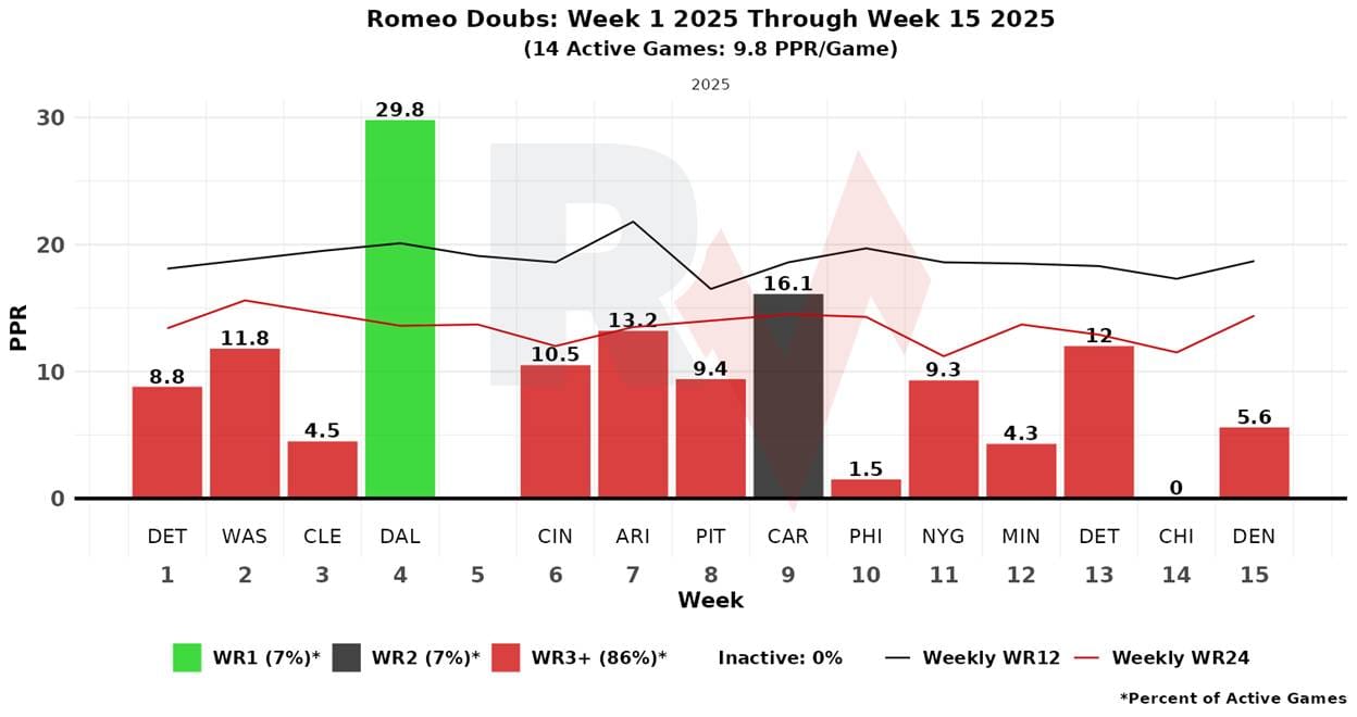 WR Romeo Doubs runs the most routes as a Z-receiver who doesn’t come out on any personnel package. He isn’t overly efficient. He is capable of putting up meager but usable lines; his one spike week came in a shootout with Dallas with a combined 80 points. He’s not a high upside option, but he could be usable, especially if he can score a TD.