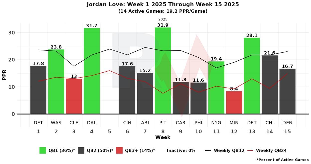 On the flip side, Love has been a QB1 five times, including three spike weeks with at or around 30 fantasy points.
