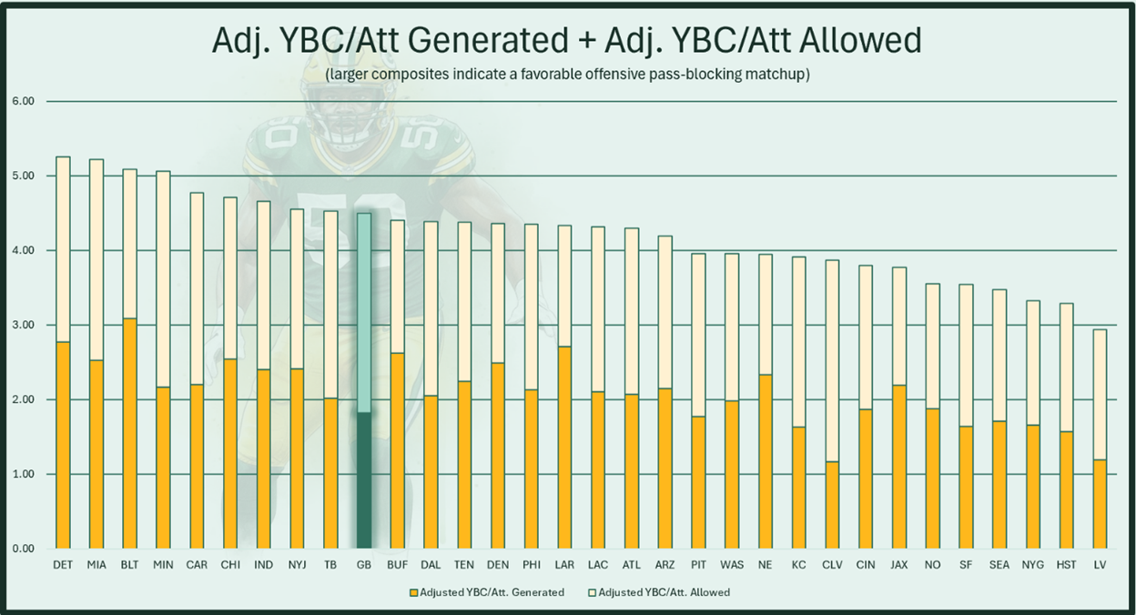 The Packers only generate 1.83 adjusted yards before contact per attempt (adj. YBC/Att, 25th). The Bears allow 2.67 adj. YBC/Att defensively (29th). This is the same story—bad on bad, but on these margins, the Packers appear to have a slight advantage in run blocking. Again, though, they may be without Tom, which could be more significant to the run-blocking matchup.