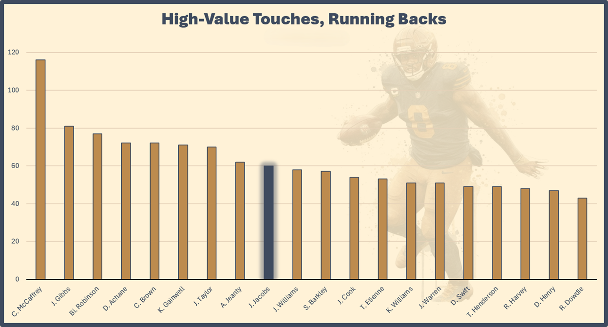 Jacobs is ninth in high-value touches (HVTs, 60). In the Week 12 game against Minnesota (a tough defense, by the way), Wilson had five of his own.