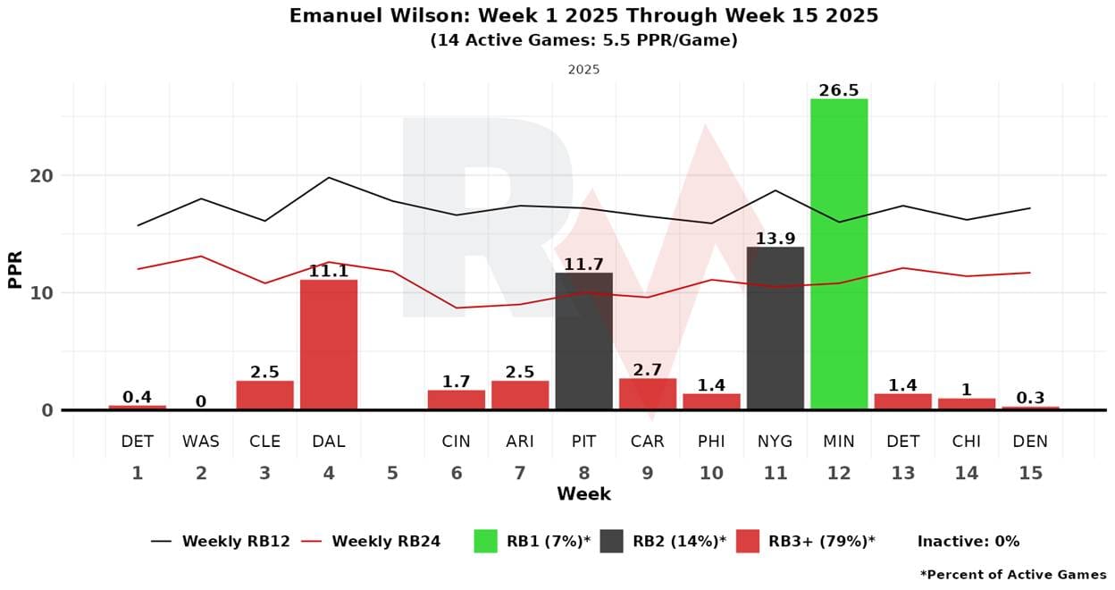 Wilson will likely get a heavy workload again, but we shouldn’t expect the same results we got in Week 12. He’s more of an RB2.