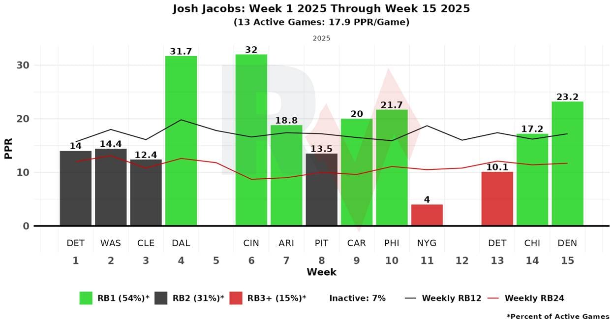 Jacobs has been an RB1 in seven of his 13 games. His only single-digit output came in Week 11, a game he left early with an injury.