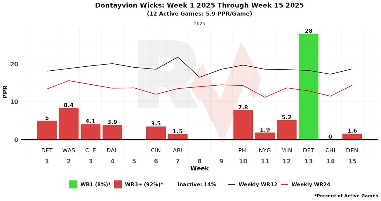 The best target earner at WR last week was Reed. The thing with Reed is that he’s one of those primary slot players who come off the field whenever the team goes to any formation where there is not a slot WR on the field (like Josh Downs, Demario Douglas, or KaVontae Turpin).