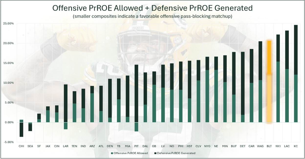 The Ravens’ offense has allowed a pressure rate over expected (PrROE) of 12.19% (28th). The Packers have generated a 8.43% PrROE on defense. The Ravens should be at a significant disadvantage in pass blocking, regardless of whether or not Parsons is playing.